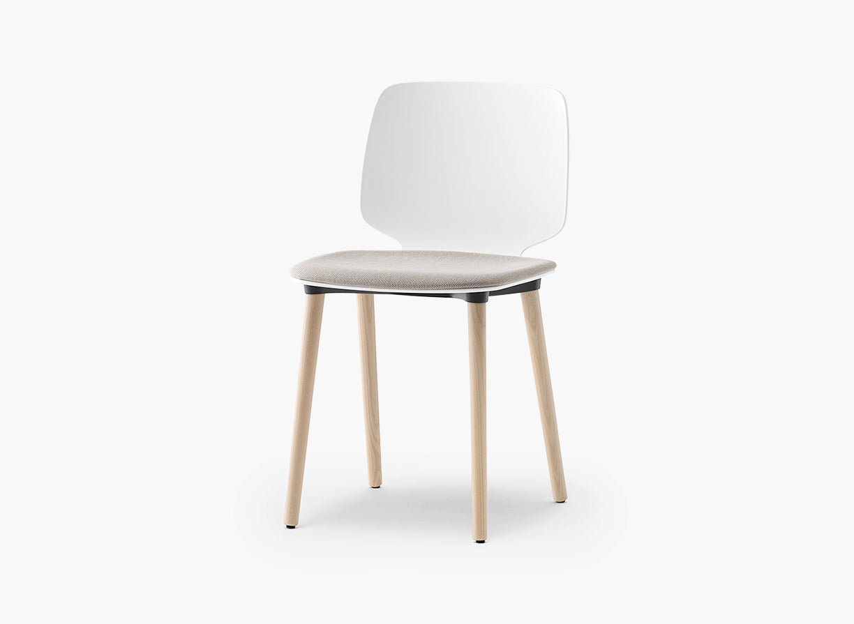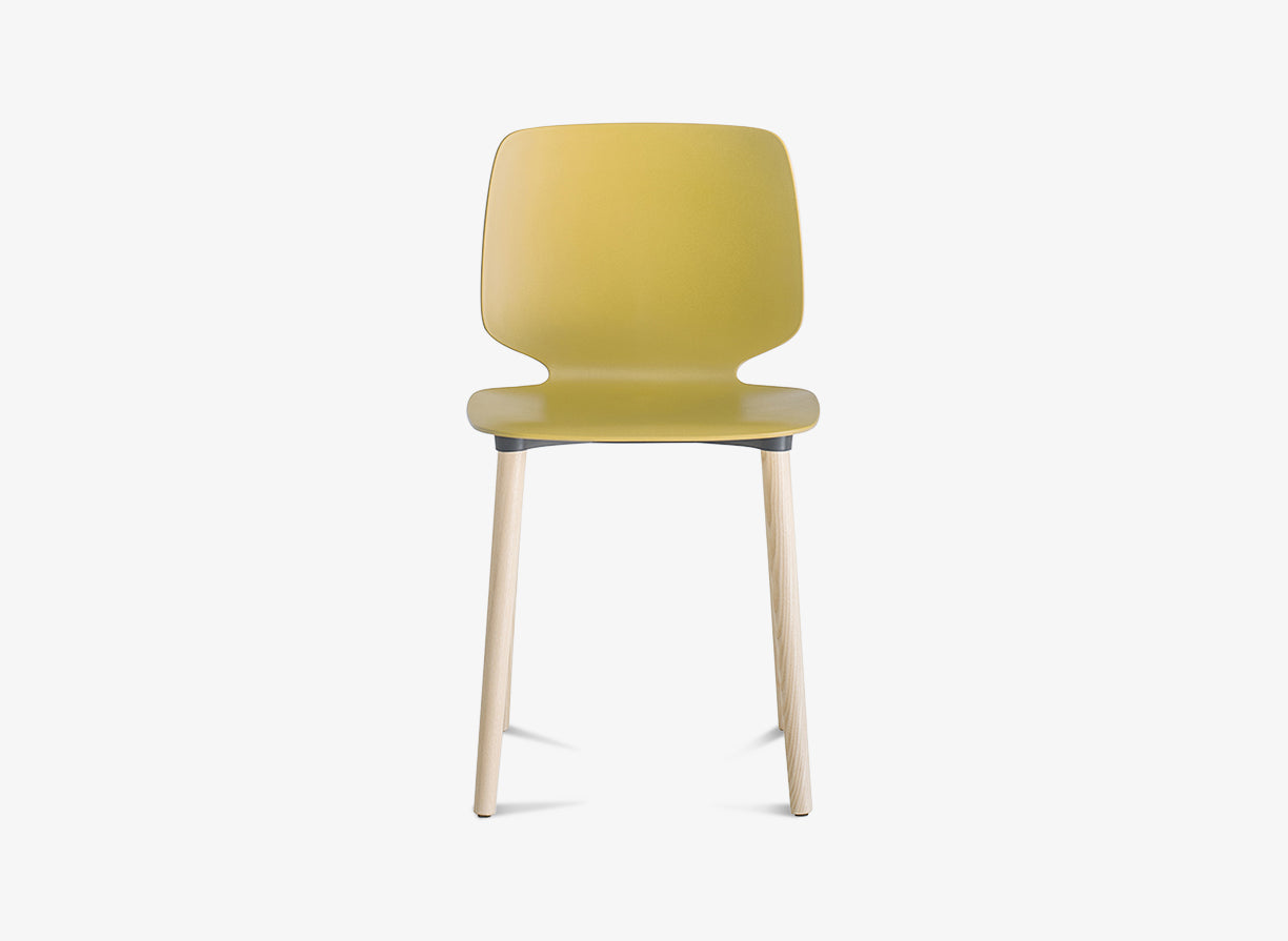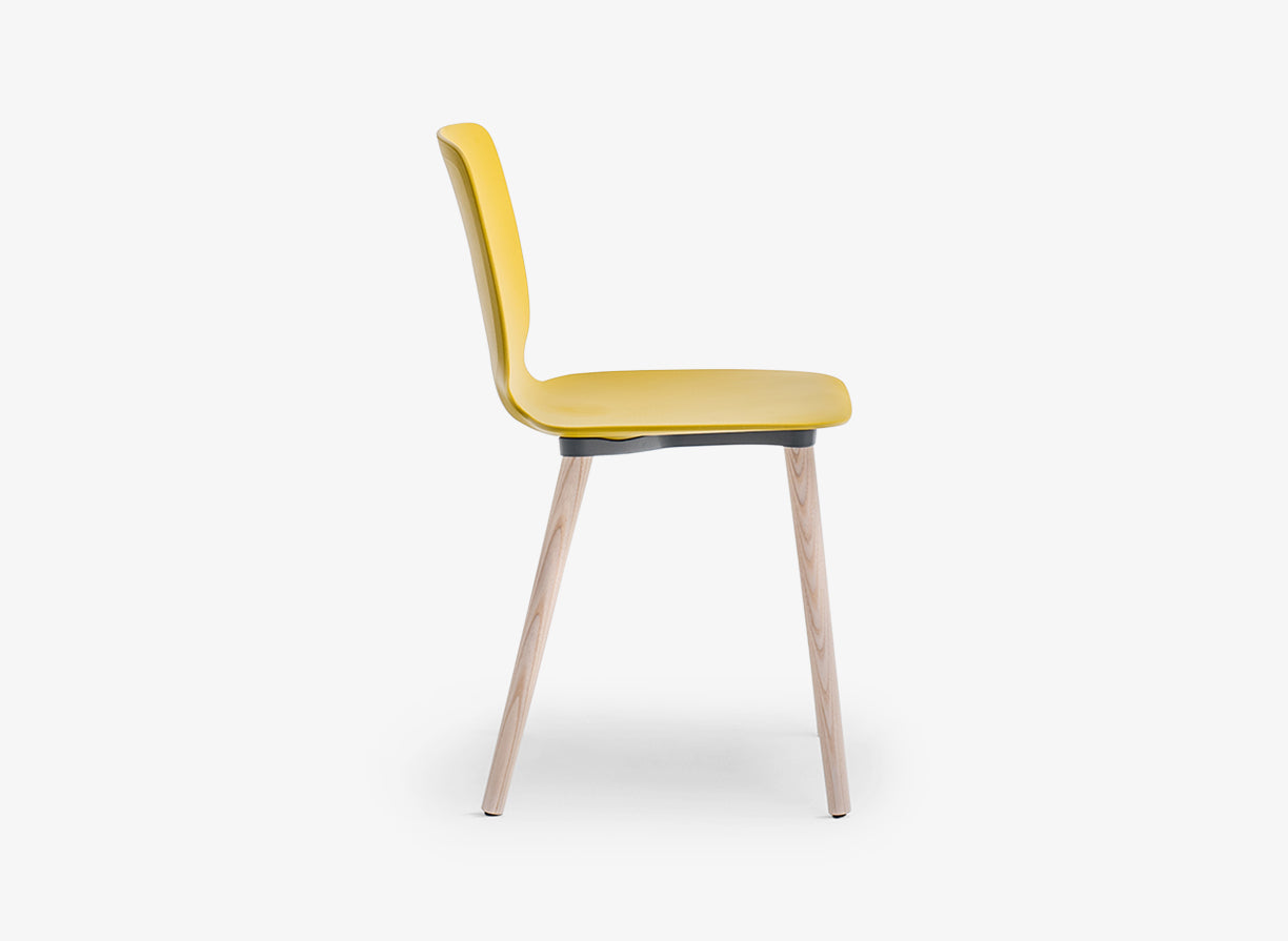 Chair with technopolymer shell and die-cast aluminium frame. Solid ash wood legs.