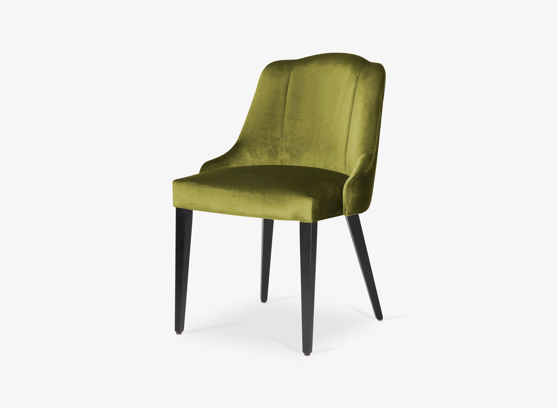 Dining chair with upholstered seat and back. Tapered solid wood legs.