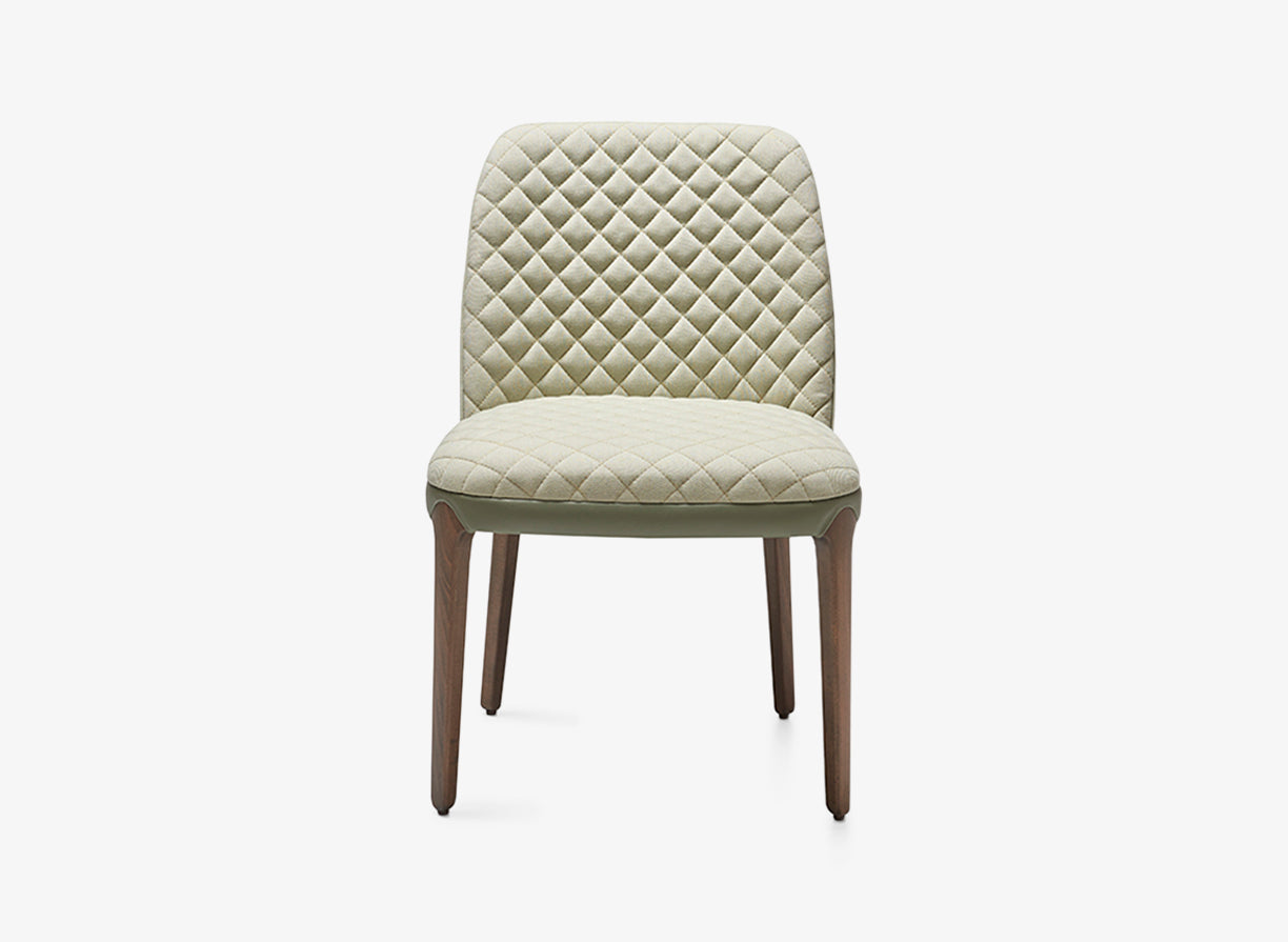 Dining chair with plywood back and solid beech legs. Upholstered quilted seat and back.