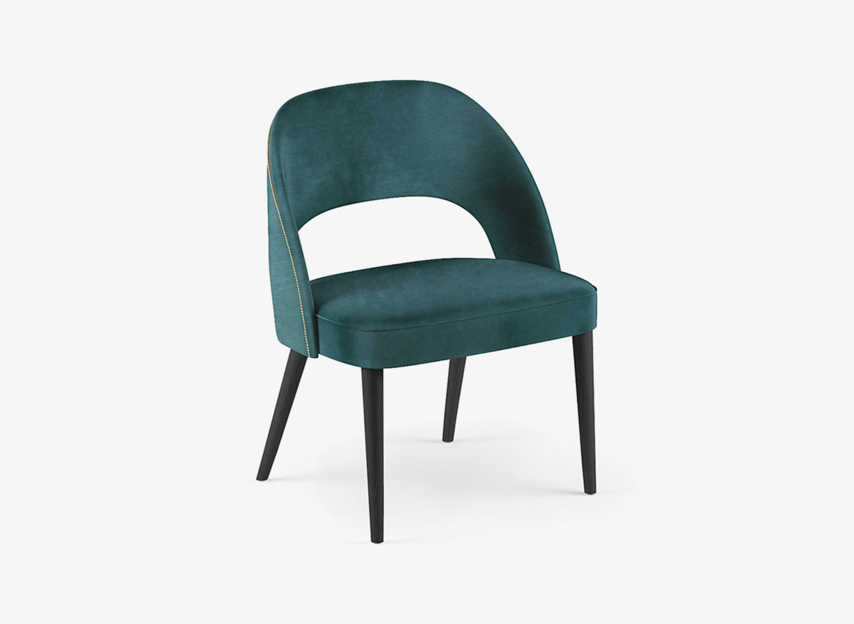 Fully upholstered wide dining side chair with timber legs.