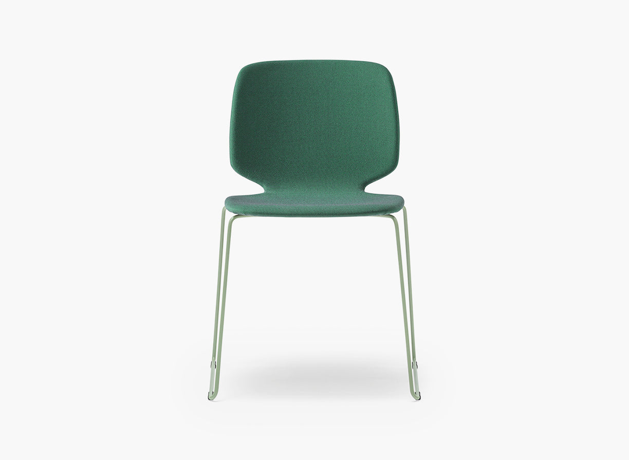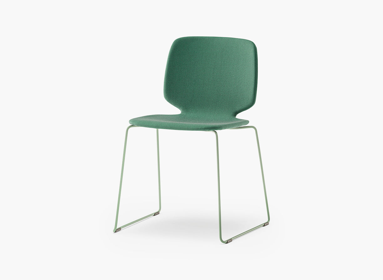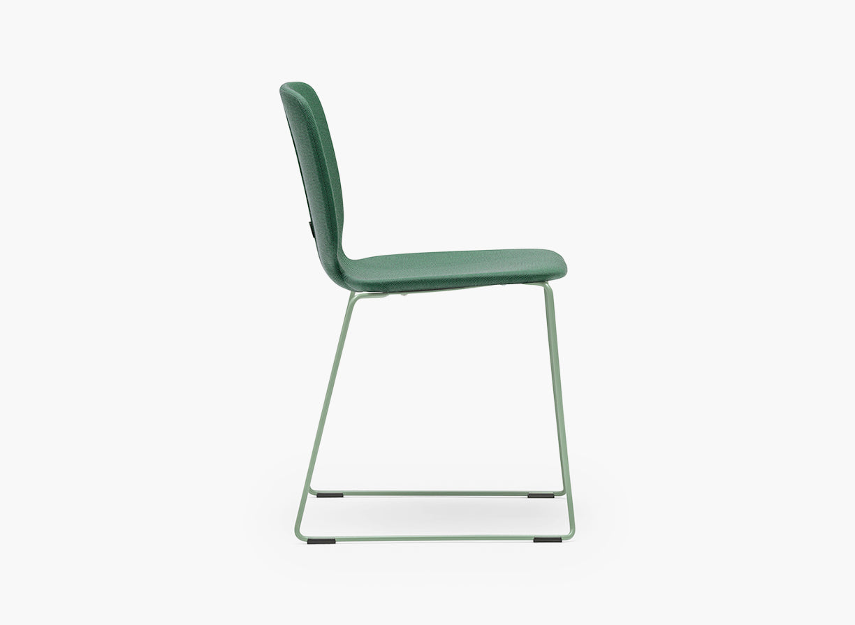 Chair with upholstered shell in fabric or simil leather and steel rod sled frame Ø10mm.