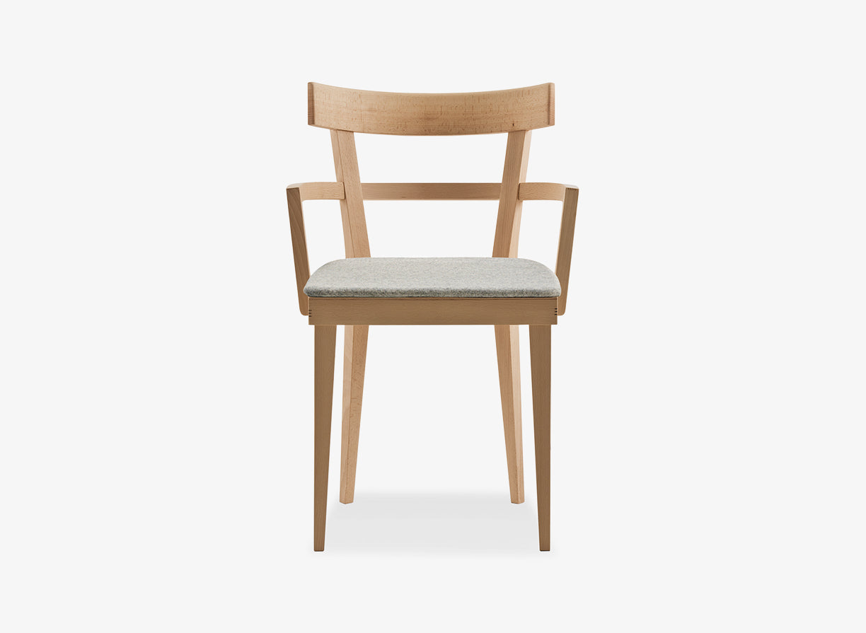 Armchair in solid beech with upholstered seat. Open back and tapered legs.