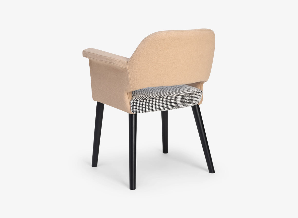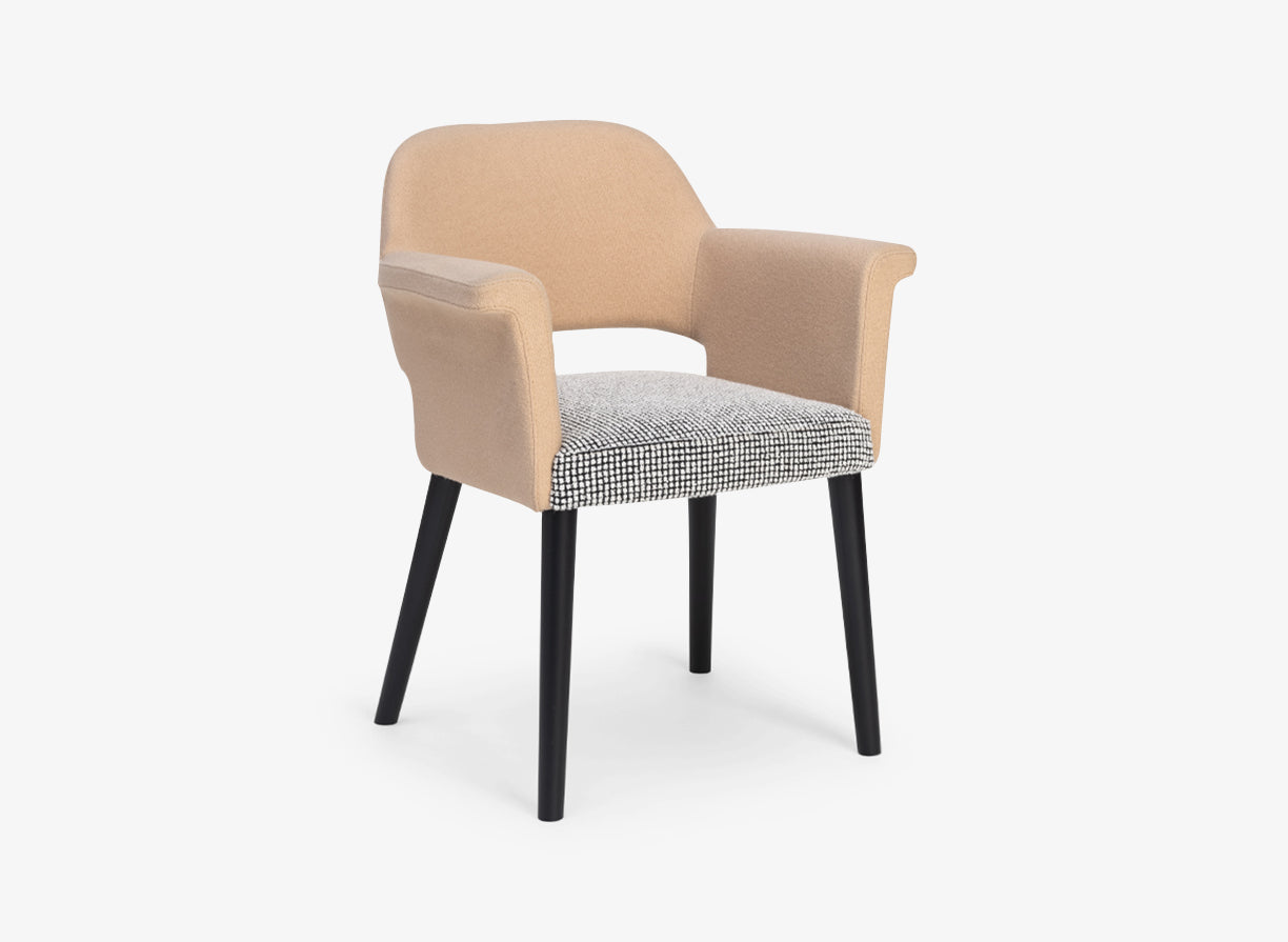 Armchair with solid beech frame. Padded seat and backrest with cut out detail. Removable seat.