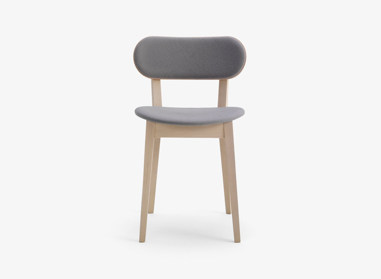 Dining chair in beech with upholstered seat and backrest. Open back and tapered legs.