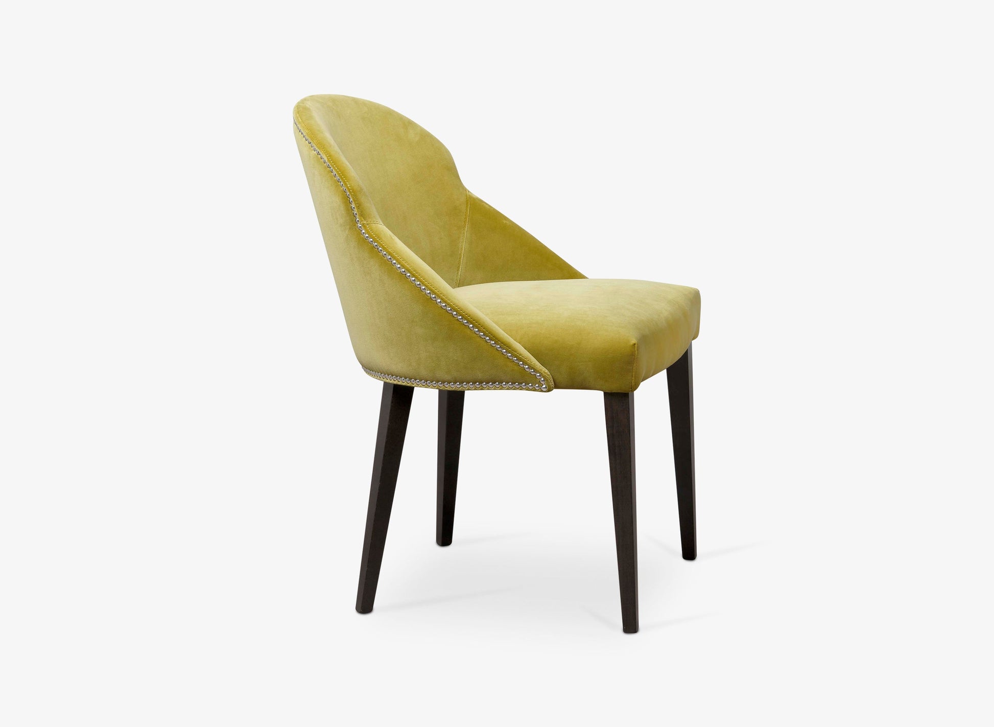 Dining chair with upholstered seat and back. Decorative stud detailing. Tapered solid wood legs.