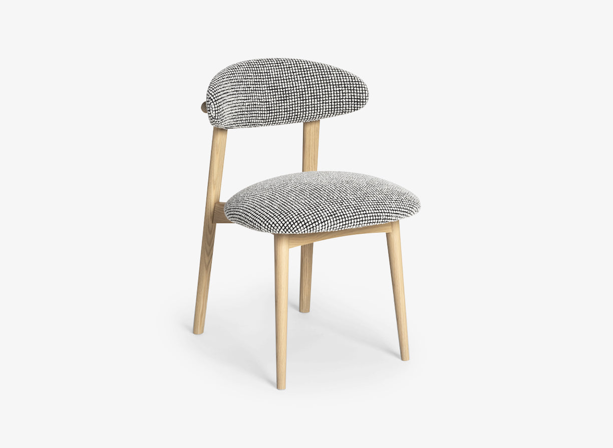 Dining chair with upholstered seat and backrest. Frame and legs in ash.